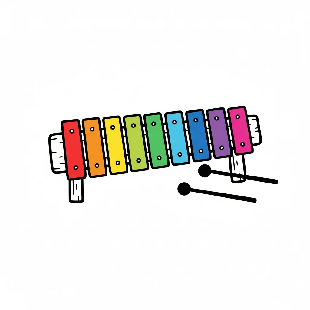Buntes Xylophon mit Schlägeln im Cartoon-Stil auf weißem Hintergrund.
