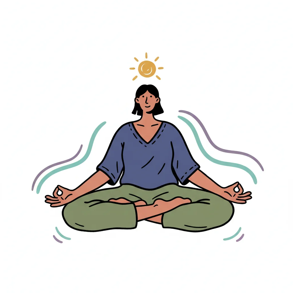 Illustration einer Person in Meditationshaltung mit Sonne über dem Kopf und Wellenlinien.
