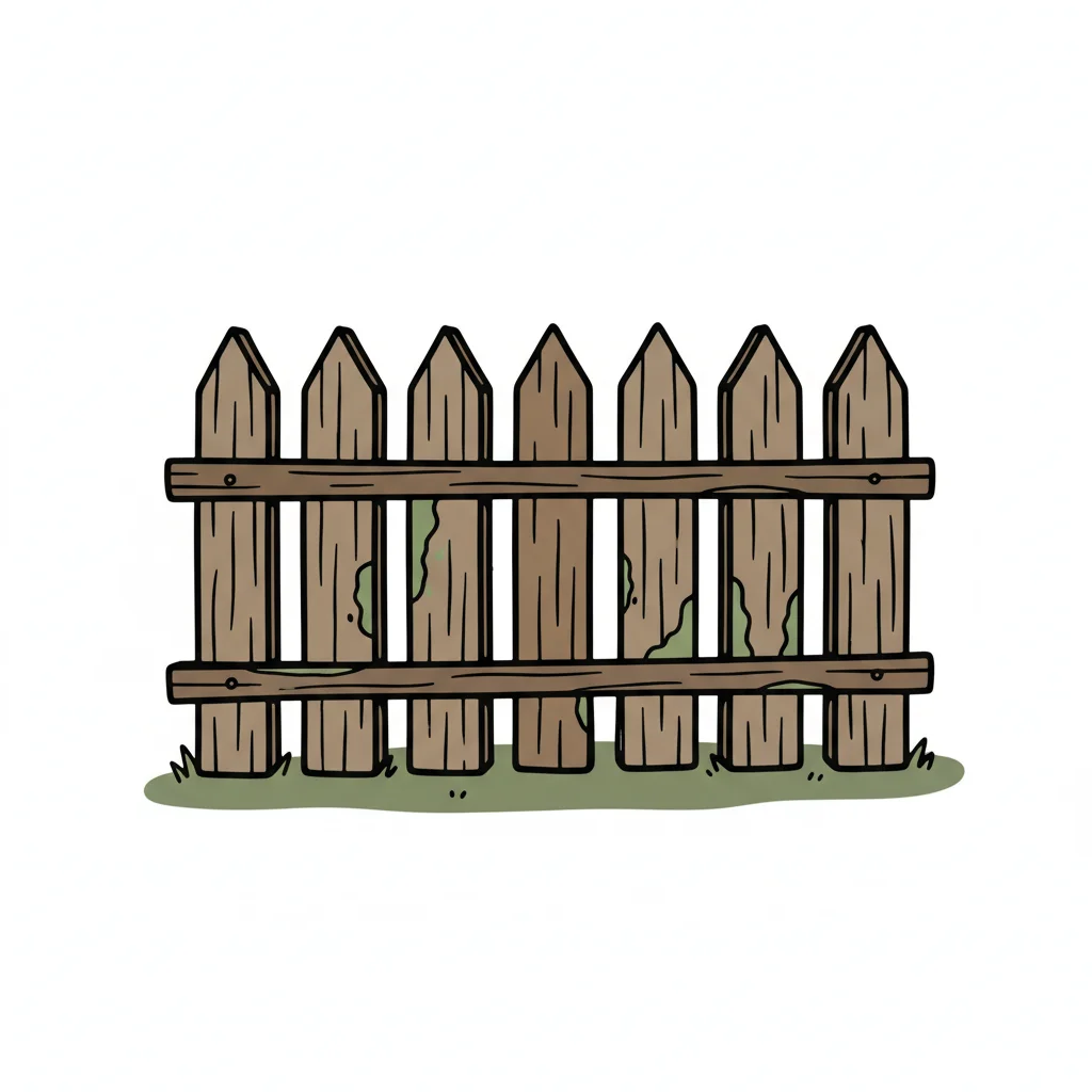 Illustration eines braunen Holzzauns mit Moos und Gras auf weißem Hintergrund.