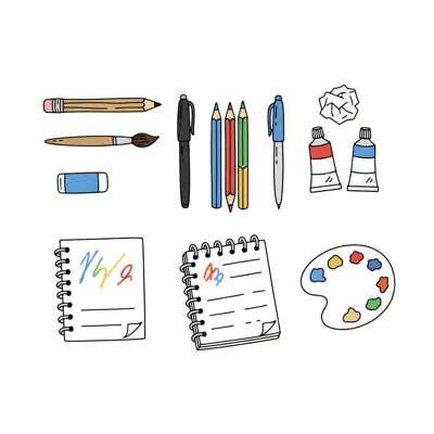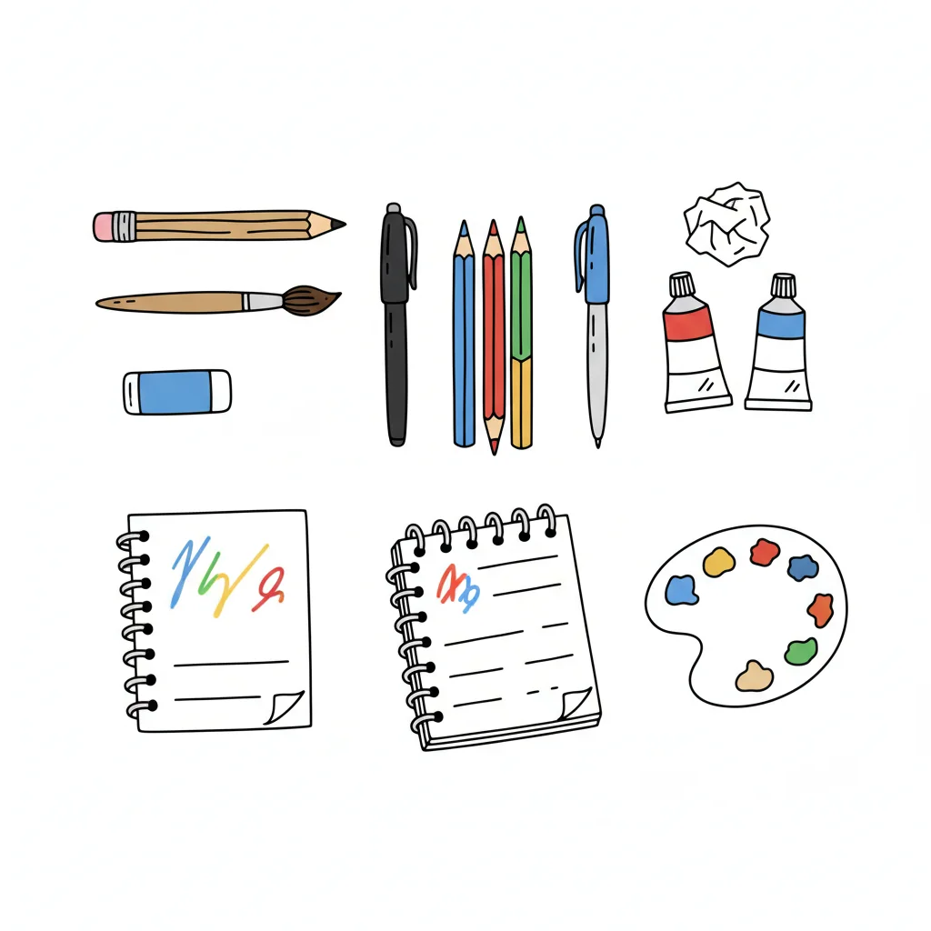 Bunte Cartoon-Darstellung verschiedener Kunst- und Schreibutensilien auf weißem Hintergrund.