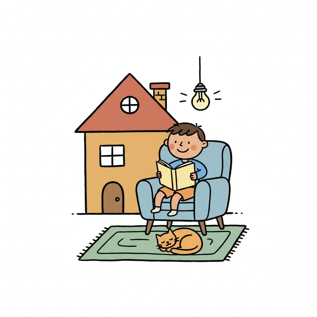 Ein Junge liest gemütlich ein Buch im Sessel, während eine Katze daneben schläft. Ein Haus ist im Hintergrund.
