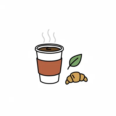 Einfache Illustration von heißem Kaffee im Becher, Croissant und einem Blatt.