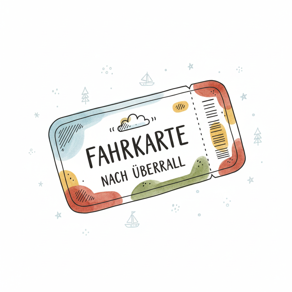 Bunte Fahrkarte "Nach Überall" im Aquarell-Stil mit kleinen Symbolen und verspielten Details.