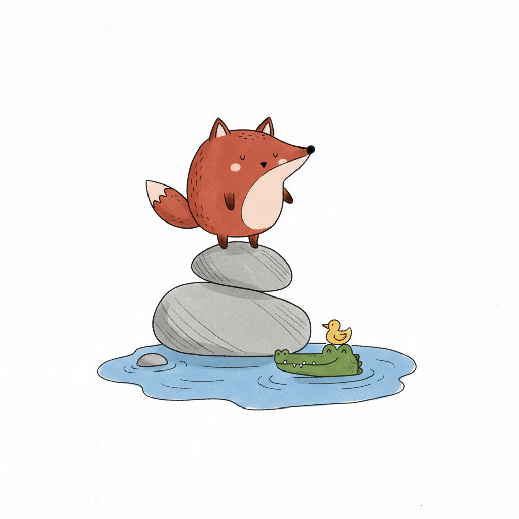 Niedlicher Fuchs balanciert auf Steinen, Krokodil mit Ente schwimmt im Wasser. Verspielte Szene.