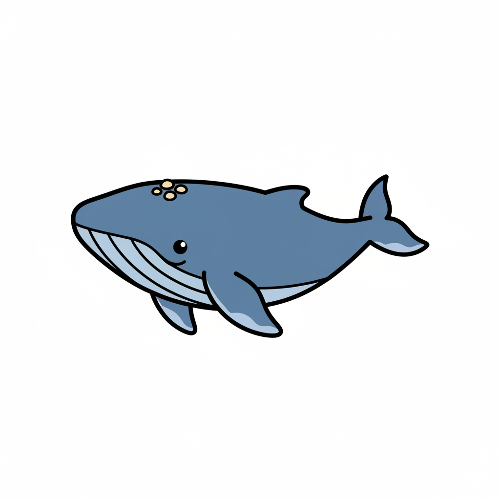 Ein stilisierter blauer Wal schwimmt in einfacher Grafik.