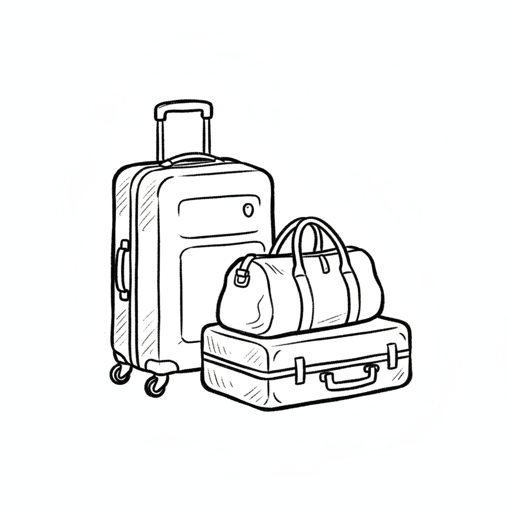 Schwarz-weiße Skizze von Reisegepäck: ein Rollkoffer, eine Reisetasche und ein weiterer Koffer.