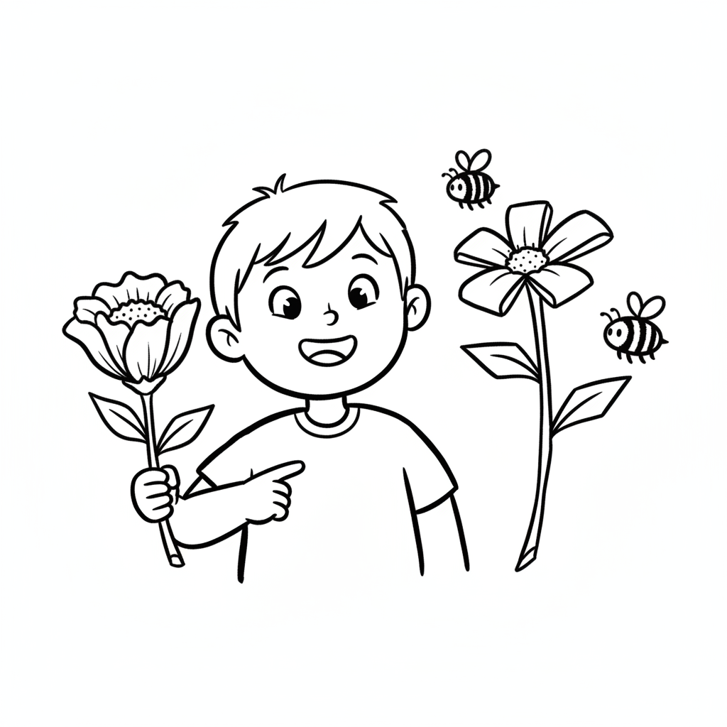 Glücklicher Junge hält Blume, Bienen fliegen um weitere Blume. Schwarz-Weiß-Malvorlage.