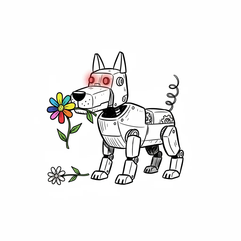 Ein Roboterhund mit leuchtenden Augen hält eine bunte Blume im Maul. Eine weitere Blume liegt am Boden.