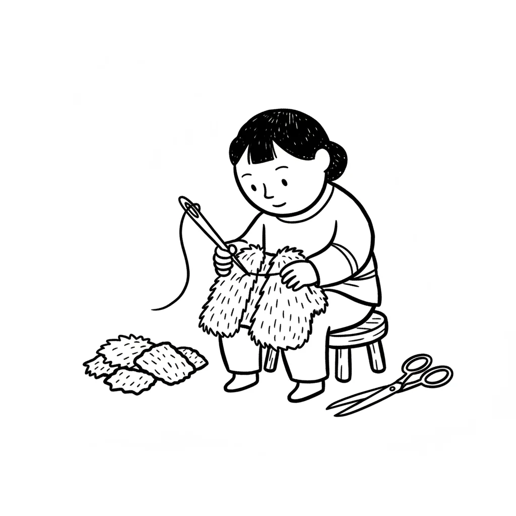 Eine Person näht flauschige Stoffstücke mit Nadel und Faden, umgeben von weiteren Stücken und einer Schere.