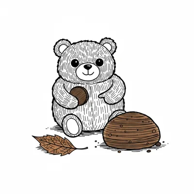 Niedlicher Bär hält eine Nuss, daneben eine weitere Nuss und ein Blatt im Skizzenstil.