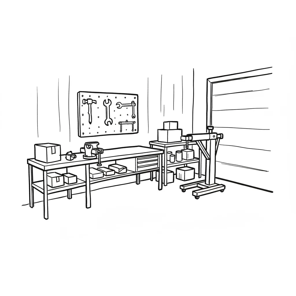 Schwarz-weiß-Skizze einer Werkstatt mit Werkbänken, Werkzeugen an der Wand und einem Garagentor.