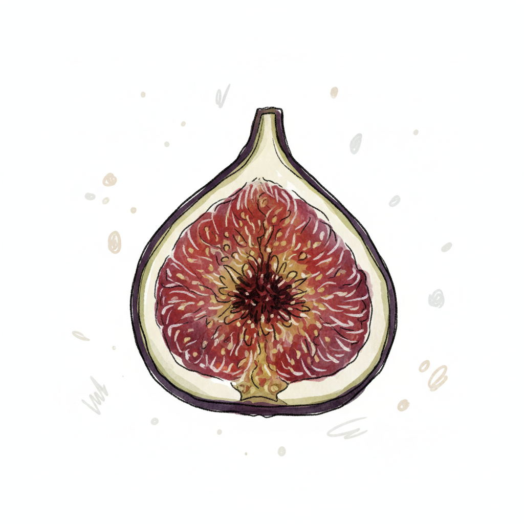 Aquarell-Illustration einer aufgeschnittenen Feige mit saftigem, rotem Inneren und Kernen auf weißem Grund.
