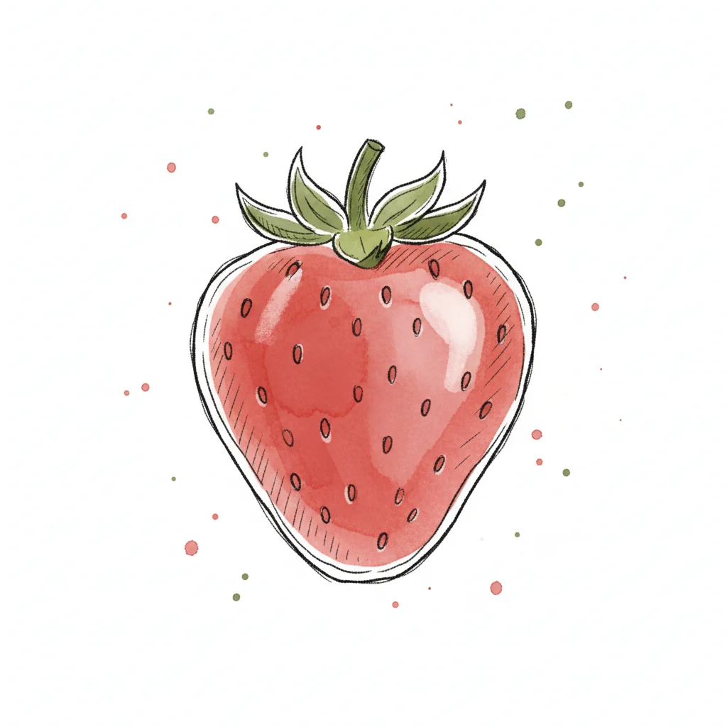 Aquarell-Illustration einer roten Erdbeere mit grünen Blättern und Farbspritzern auf weißem Grund.
