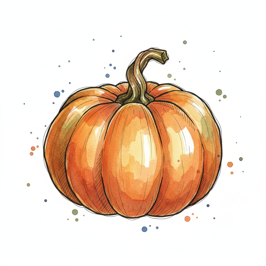 Künstlerische Aquarell-Illustration eines orangefarbenen Kürbisses mit Farbspritzern.
