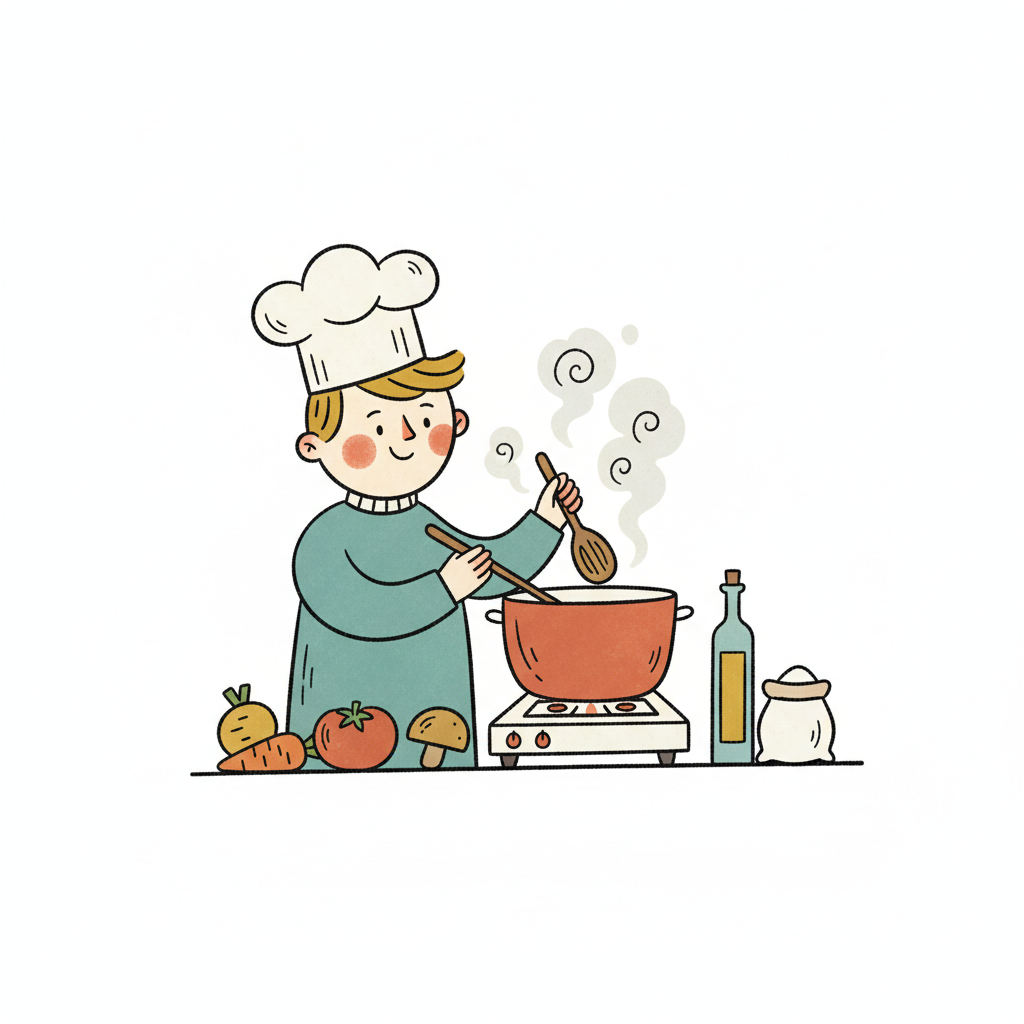 Fröhlicher Cartoon-Koch rührt in einem dampfenden Topf, umgeben von frischem Gemüse.