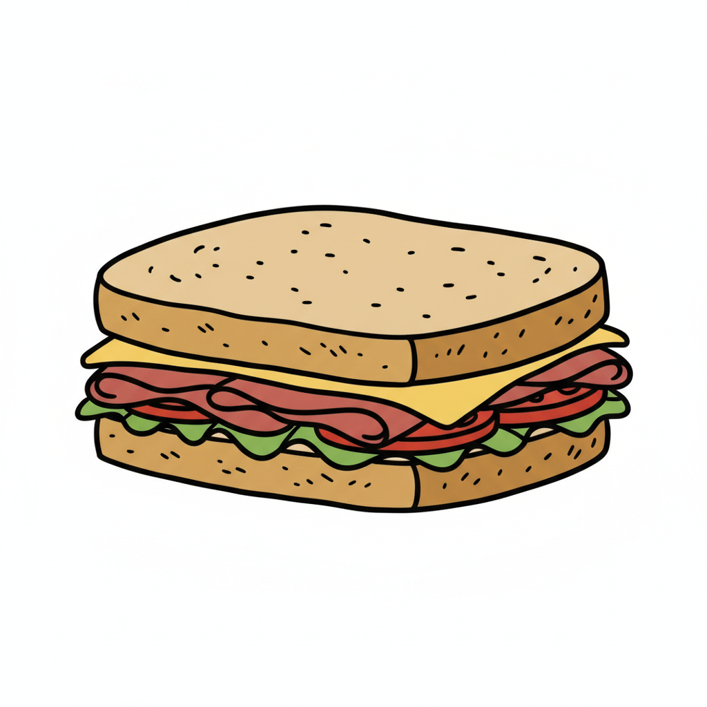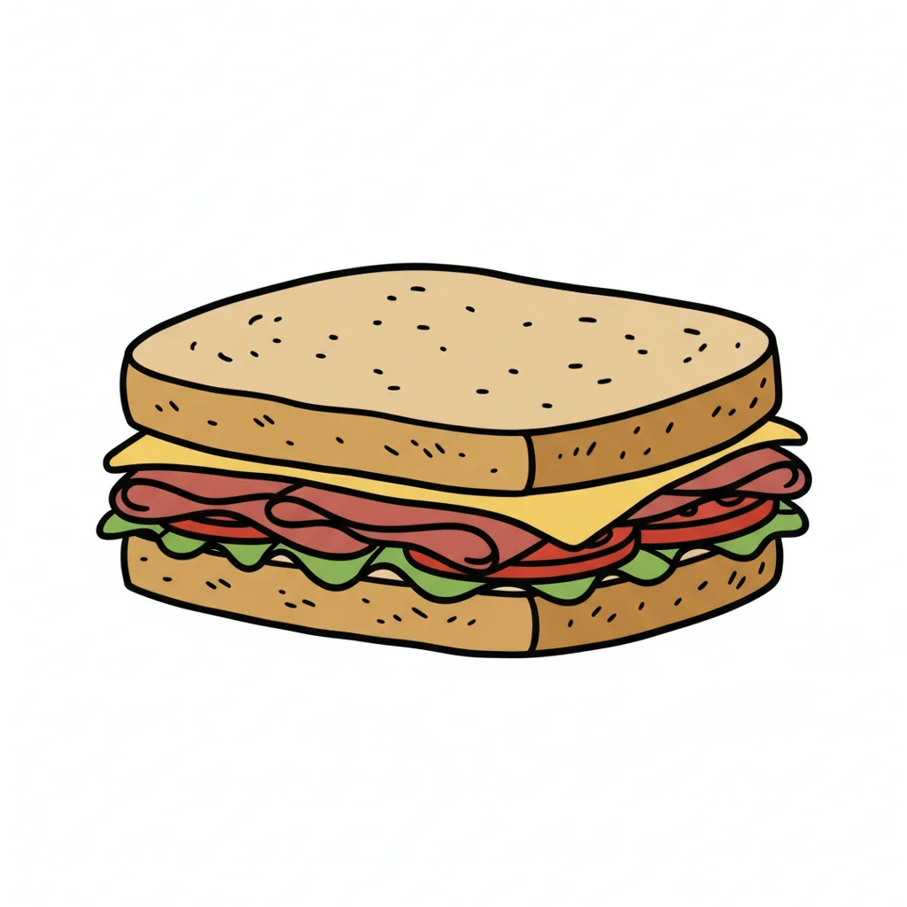 Cartoon-Stil Sandwich mit Käse, Schinken, Tomate und Salat auf weißem Hintergrund.