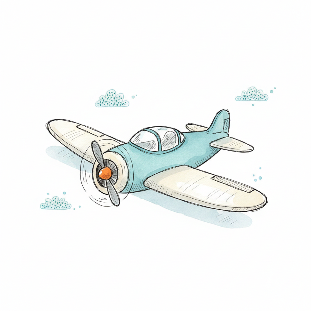 Ein handgezeichnetes blaues Flugzeug fliegt durch den Himmel mit Wolken.