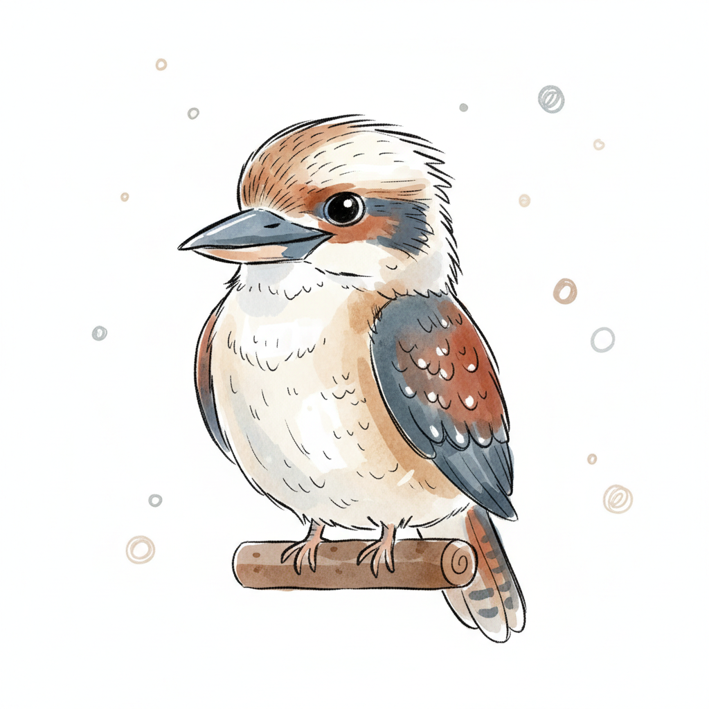 Niedliche Aquarell-Illustration eines Kookaburras auf einem Ast mit sanften Farben.