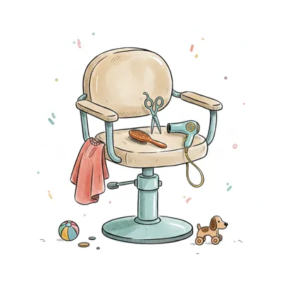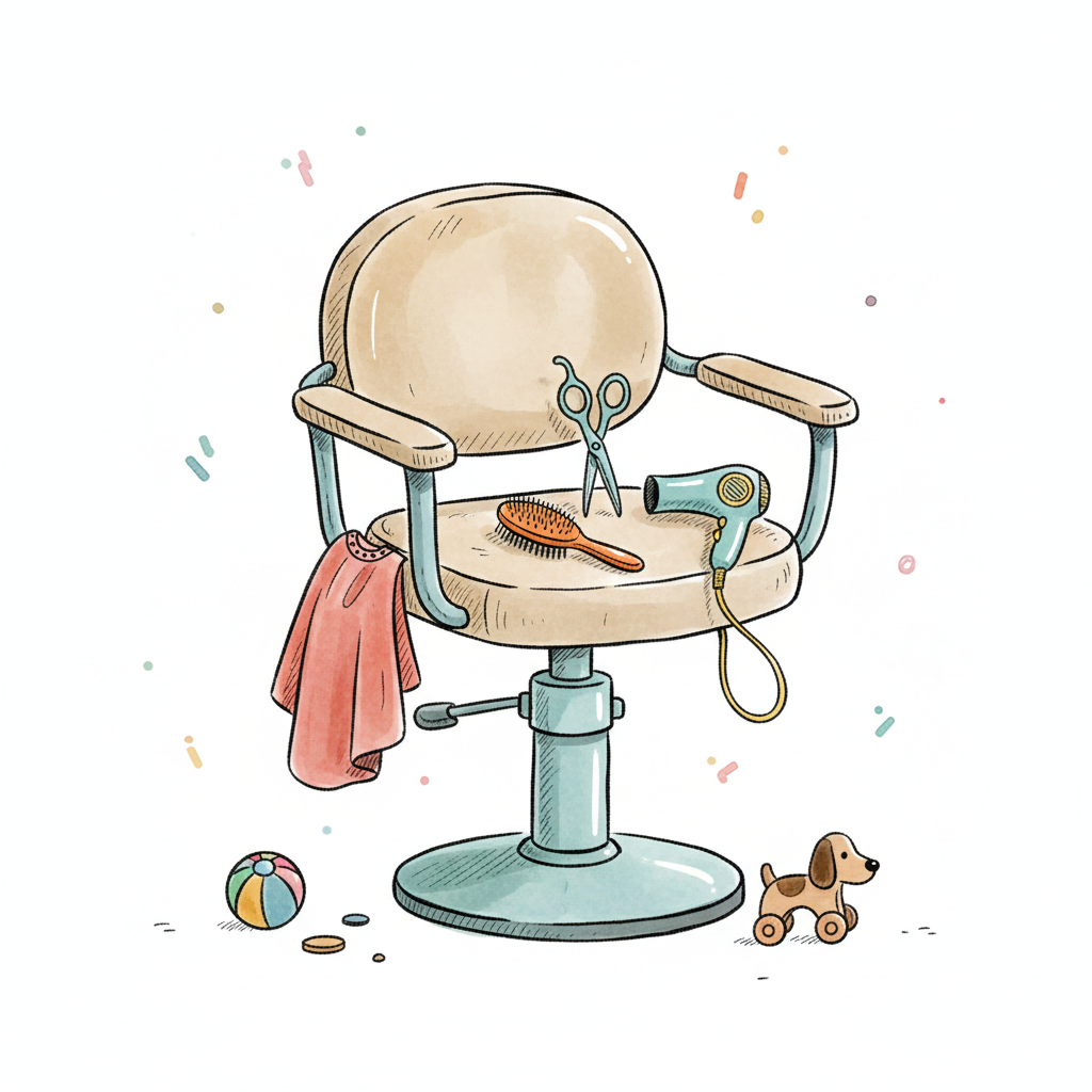 Aquarell-Illustration eines Friseurstuhls mit Schere, Bürste, Föhn und Kinderspielzeug.