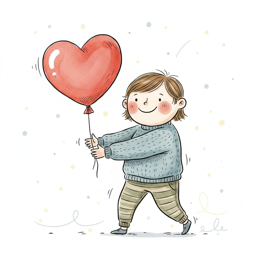 Fröhliches Kind hält einen roten Herzballon und lächelt.