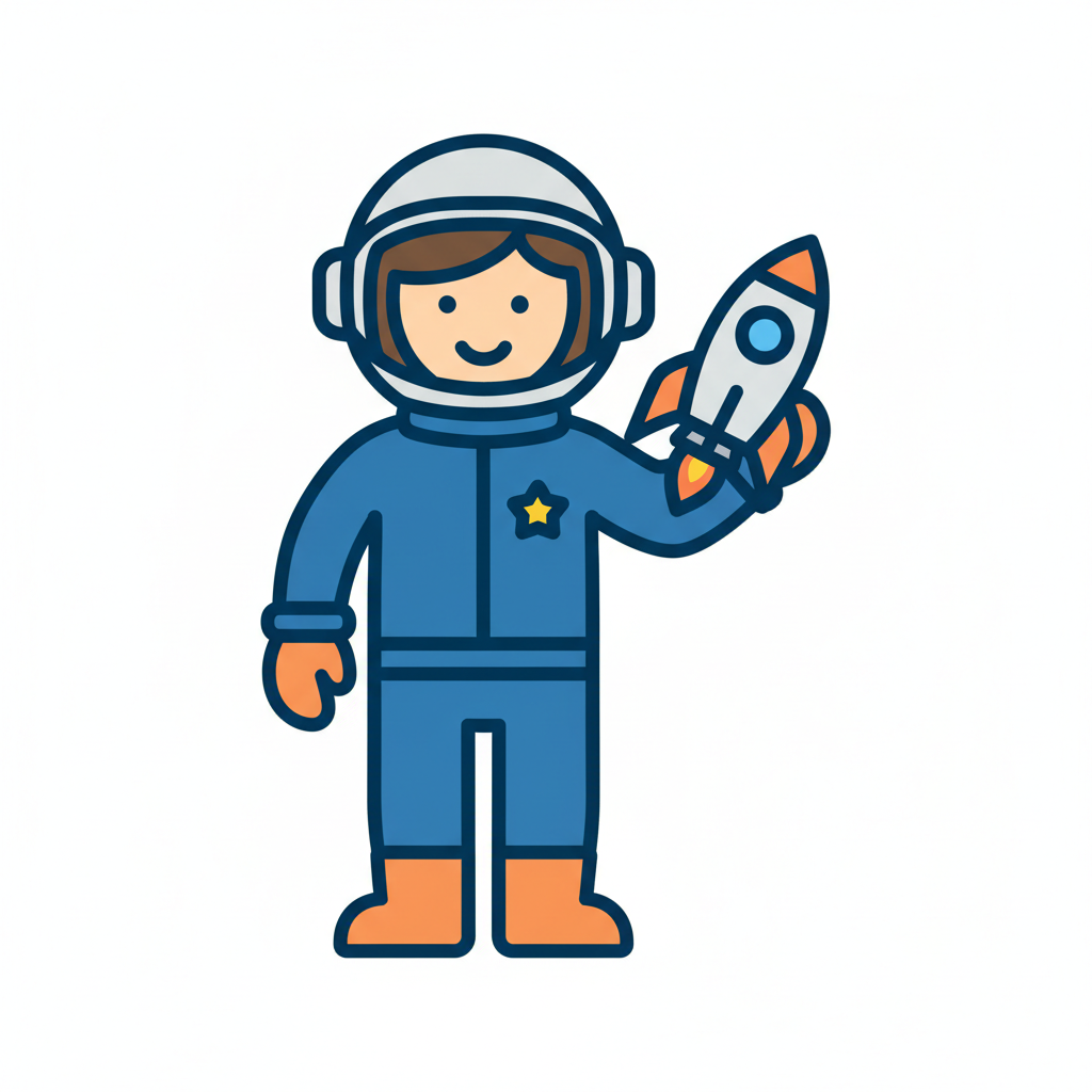 Cartoon-Astronaut in blauem Anzug hält eine kleine Rakete. Freundliches Lächeln.