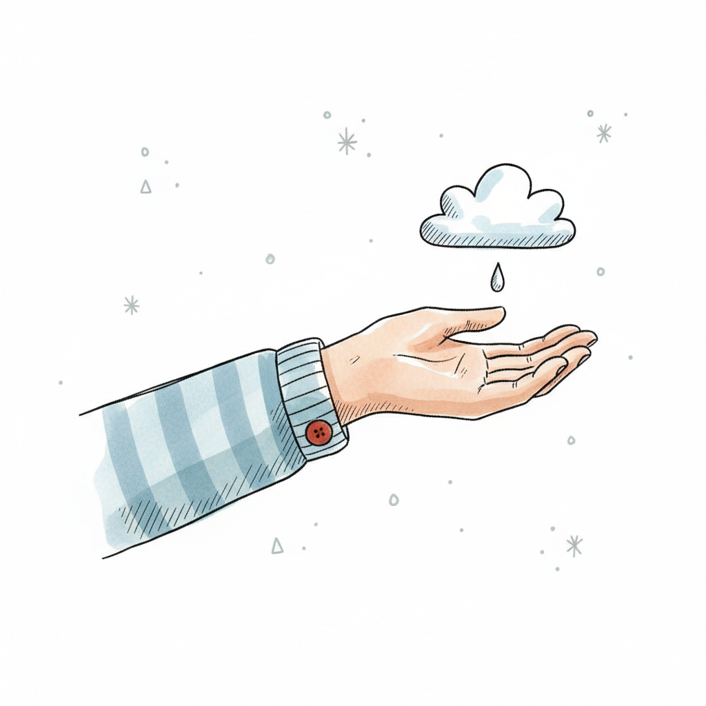 Eine Hand hält eine Wolke mit einem Regentropfen.