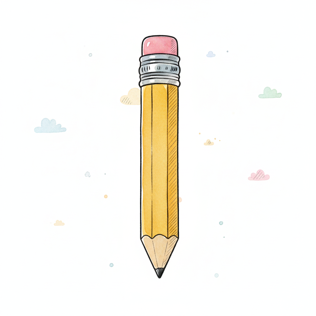 Ein gezeichneter Bleistift mit rosa Radiergummi und bunten Wolken im Hintergrund.