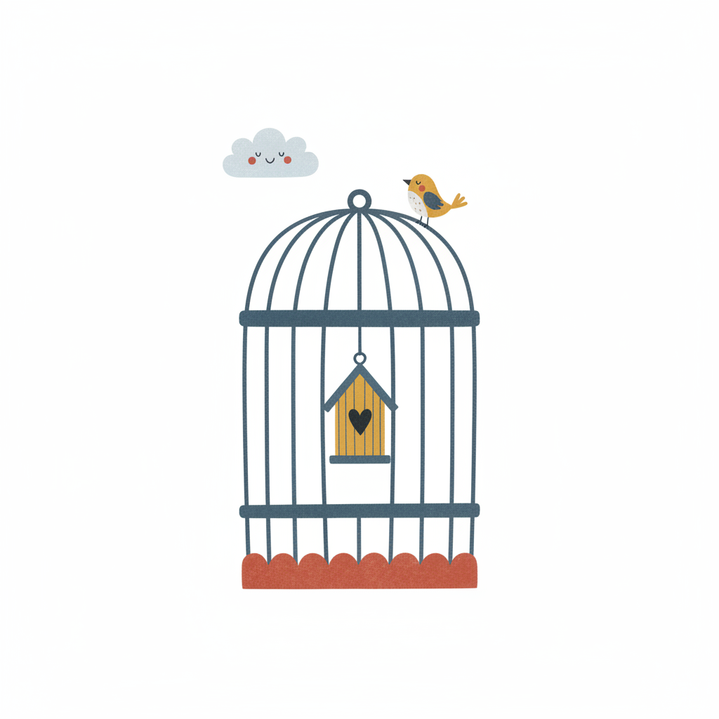 Niedliche Illustration: Vogel auf Käfig mit Vogelhaus und lächelnder Wolke.