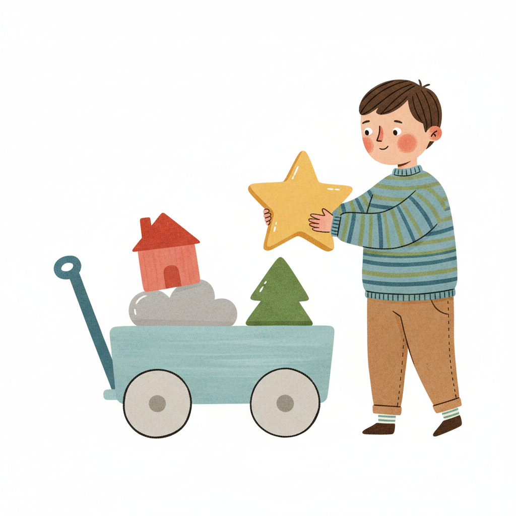 Junge hält einen Stern, daneben ein Wagen mit Haus, Baum und Wolke. Kindliche Illustration.
