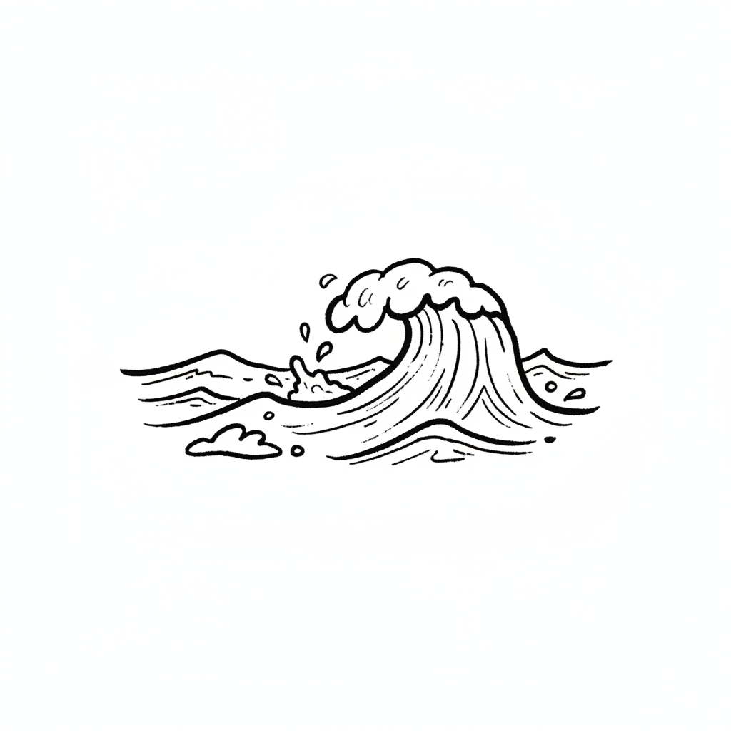 Stilisierte Schwarz-Weiß-Illustration einer großen Welle mit Gischt und kleineren Wellen.