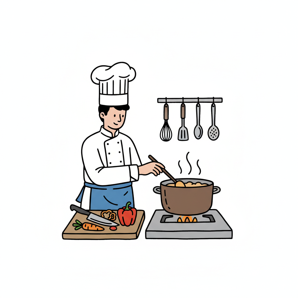 Ein lächelnder Cartoon-Koch steht neben einem kochenden Topf mit Dampf und Löffel.