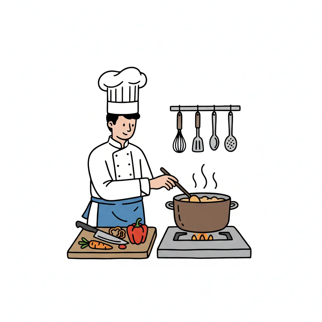 Cartoon-Junge mit Kochmütze und Schürze kocht am Herd, rührt in einem Topf.
