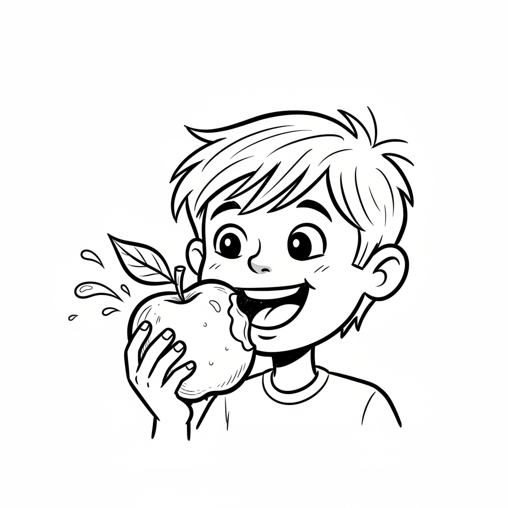 Ein glücklicher Cartoon-Junge beißt genüsslich in einen saftigen Apfel. Schwarz-Weiß-Zeichnung.