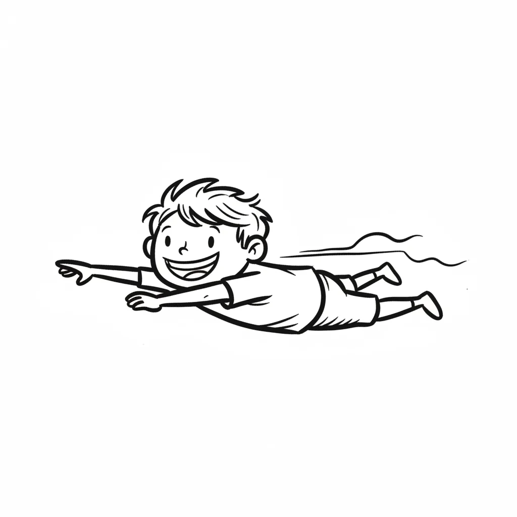 Fröhlicher Cartoon-Junge fliegt oder schwimmt mit ausgestreckten Armen in Schwarz-Weiß-Illustration.