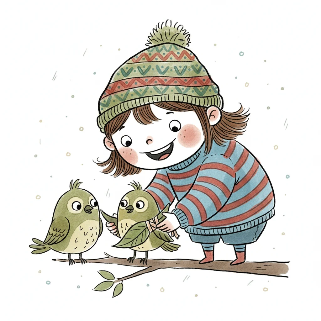 Fröhliches Mädchen in Mütze füttert zwei Vögel auf einem Ast, einer hält ein Blatt.