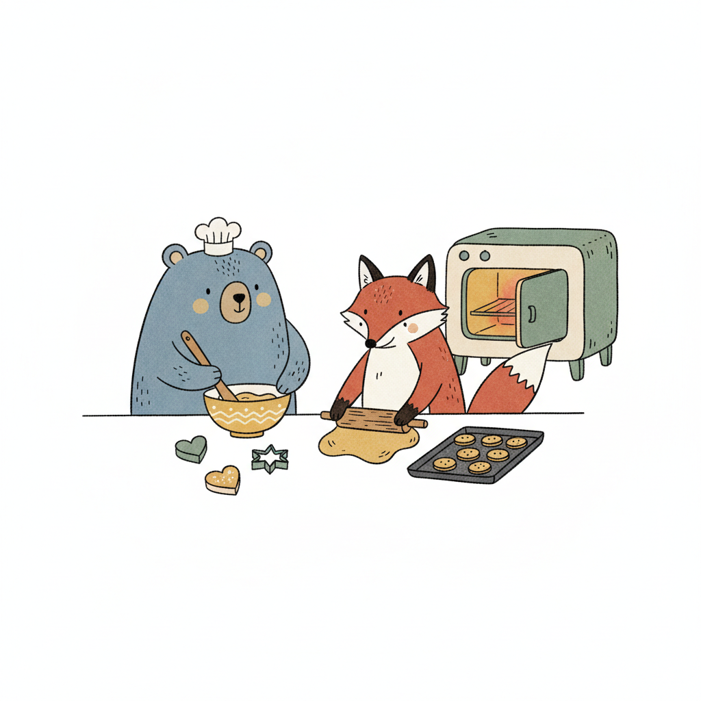 Niedlicher Bär und Fuchs backen Kekse zusammen, mit Teig, Ausstechern und Ofen.