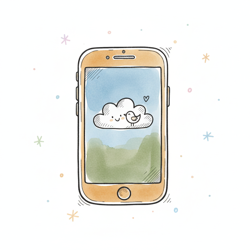 Handgezeichnetes Smartphone mit niedlicher Wolke, Vogel und Herz auf dem Display in Aquarelloptik.