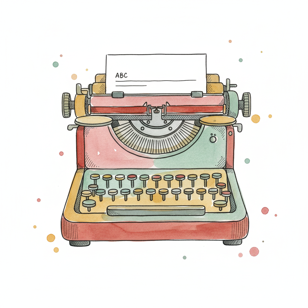 Bunte Aquarell-Illustration einer Vintage-Schreibmaschine mit Papier und "ABC".