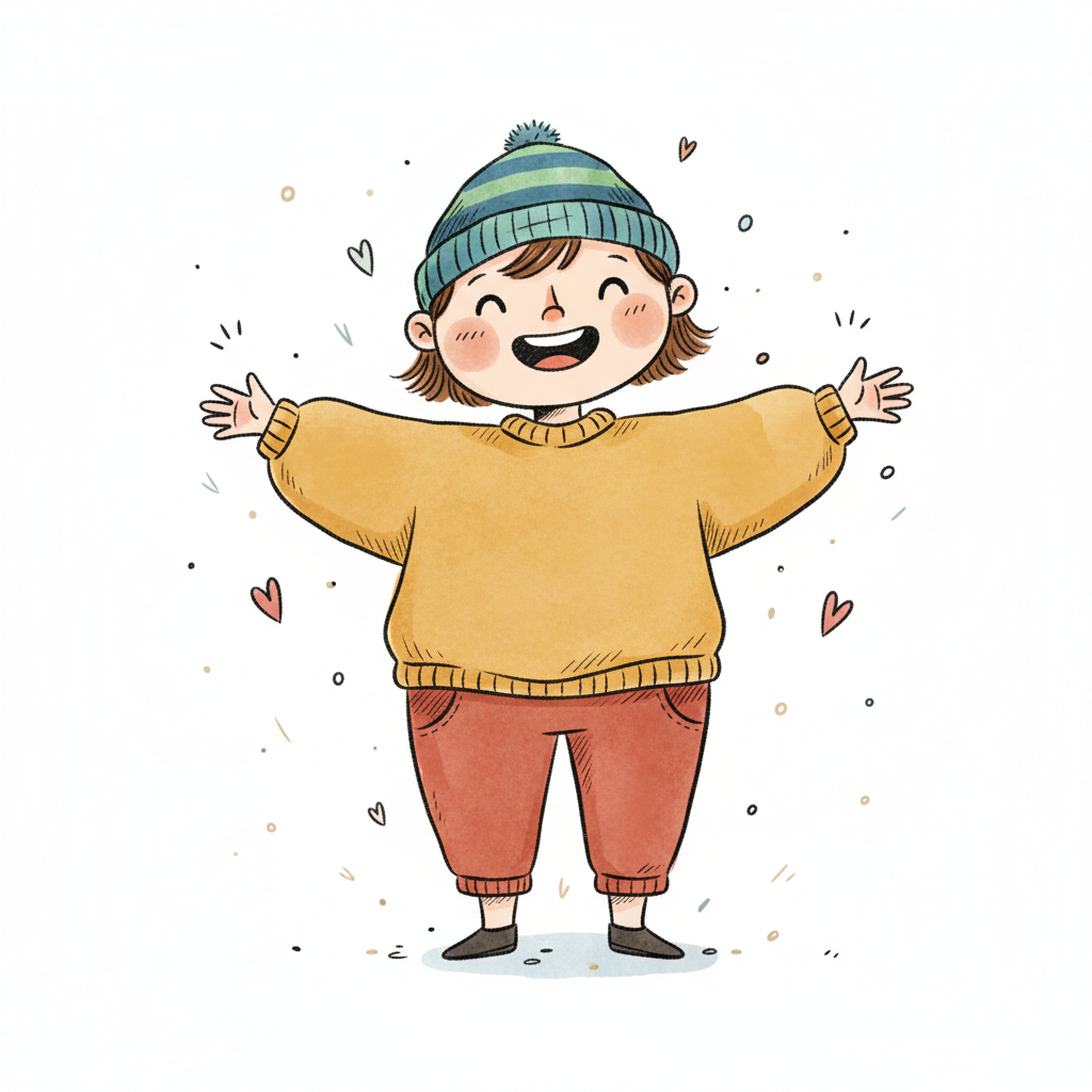 Glückliches Cartoon-Kind mit Mütze und Pullover, die Arme zum Umarmen geöffnet, umgeben von Herzen.