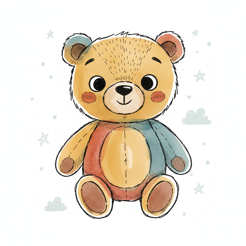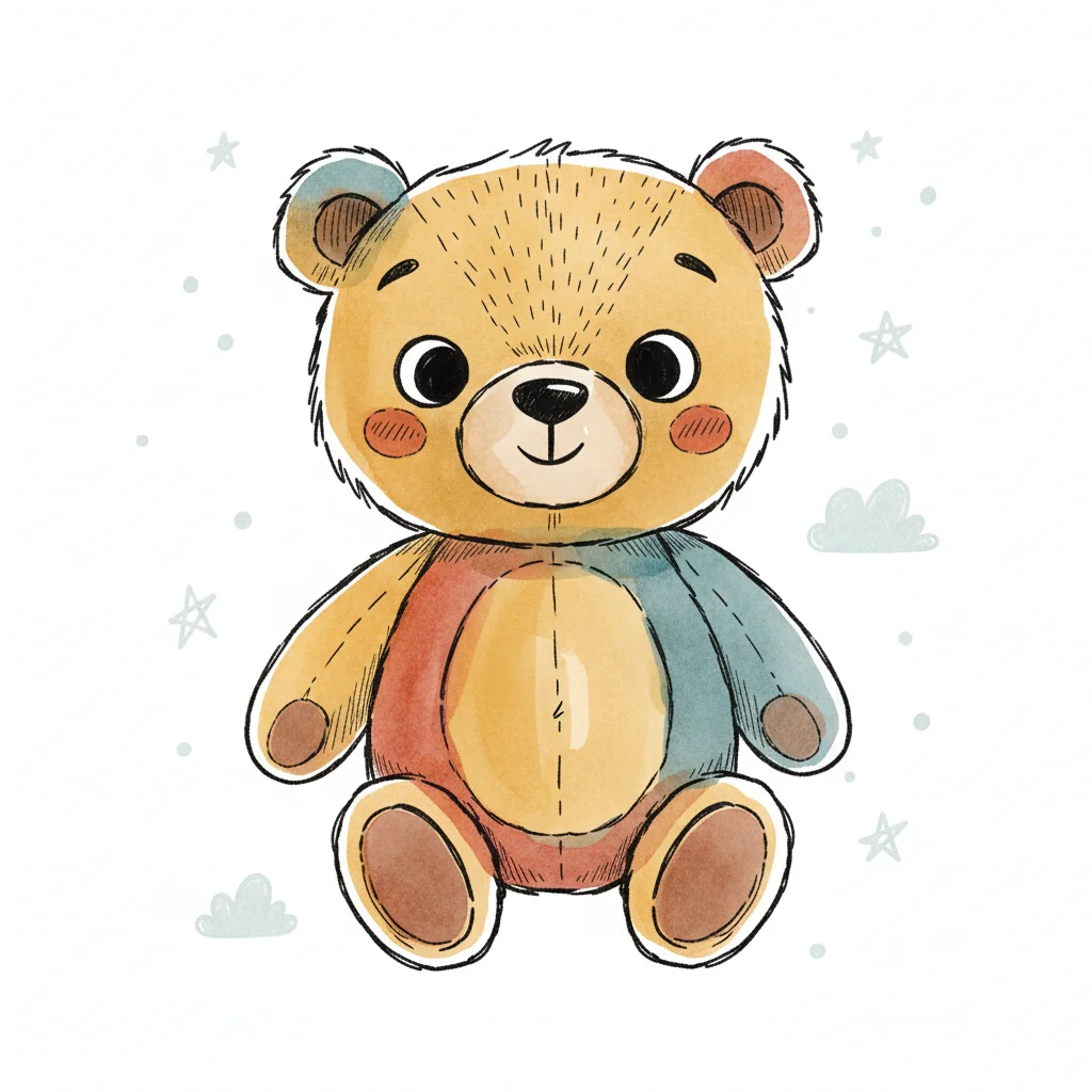 Niedlicher, bunter Teddybär im Aquarellstil mit Sternen und Wolken im Hintergrund.