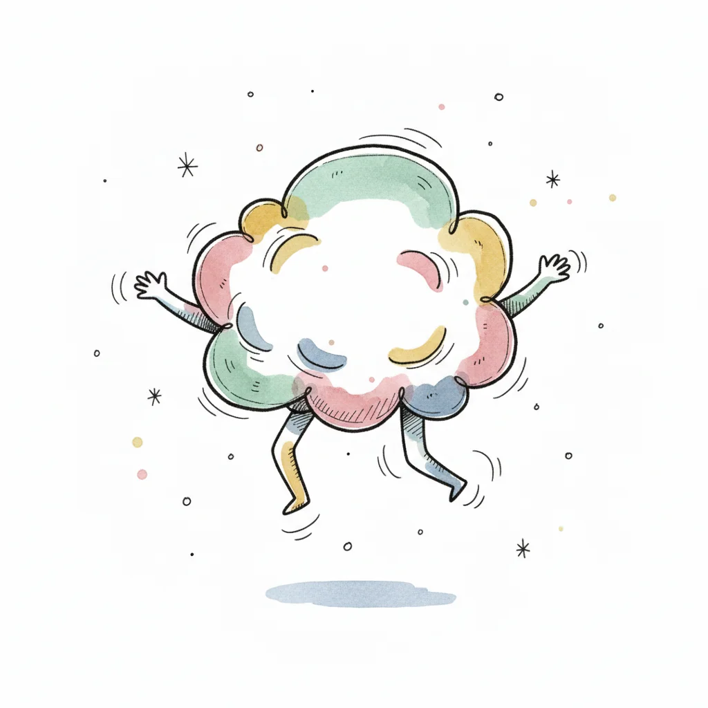 Bunte, fröhliche Wolke mit Armen und Beinen springt oder tanzt auf weißem Hintergrund.