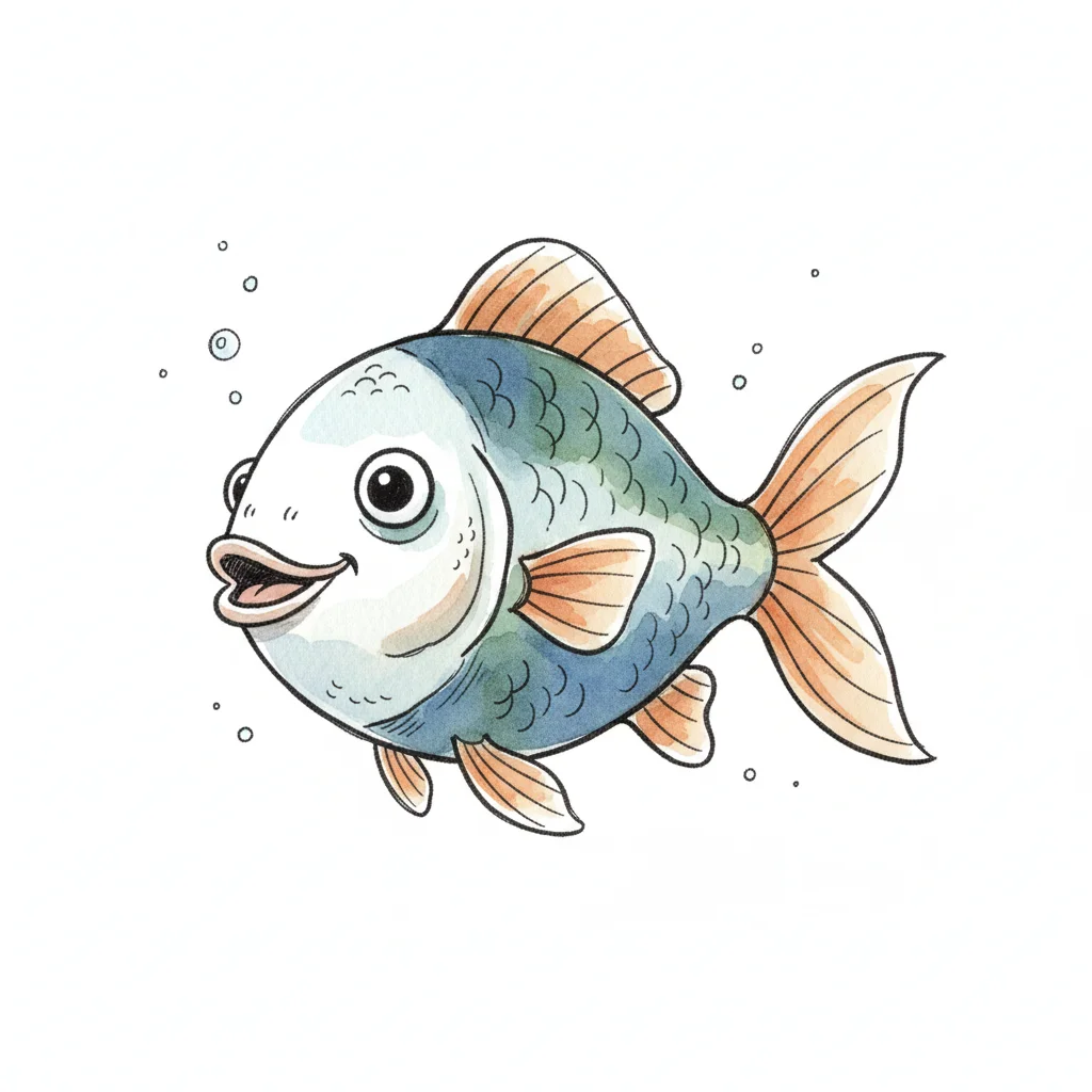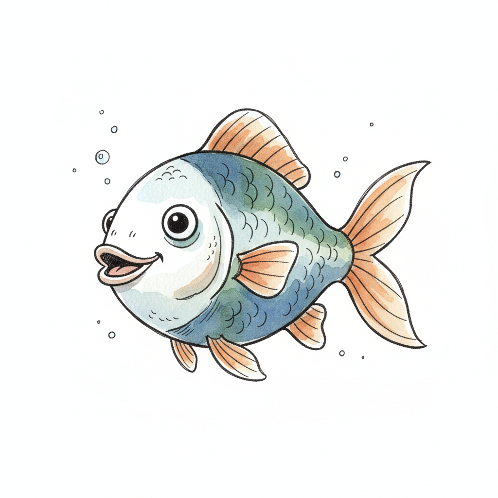 Ein fröhlicher Fisch mit großen Augen schwimmt im Wasser.