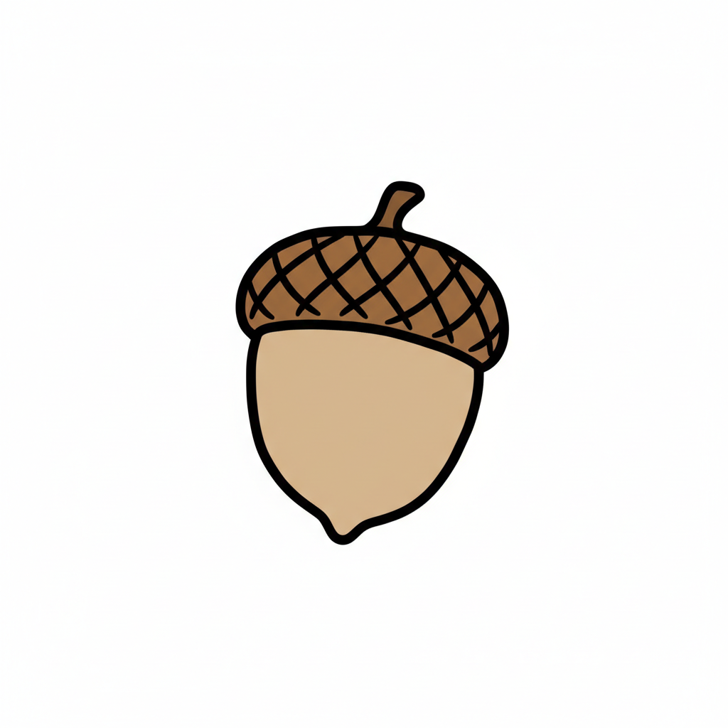 Cartoon-Eichel mit braunem Körper und gemusterter Kappe auf weißem Hintergrund.