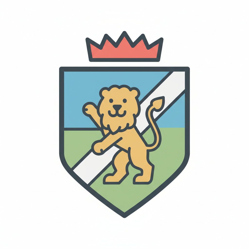 Wappen mit goldenem Löwen, blau-grünem Schild, weißem Streifen und roter Krone im Flat-Design.