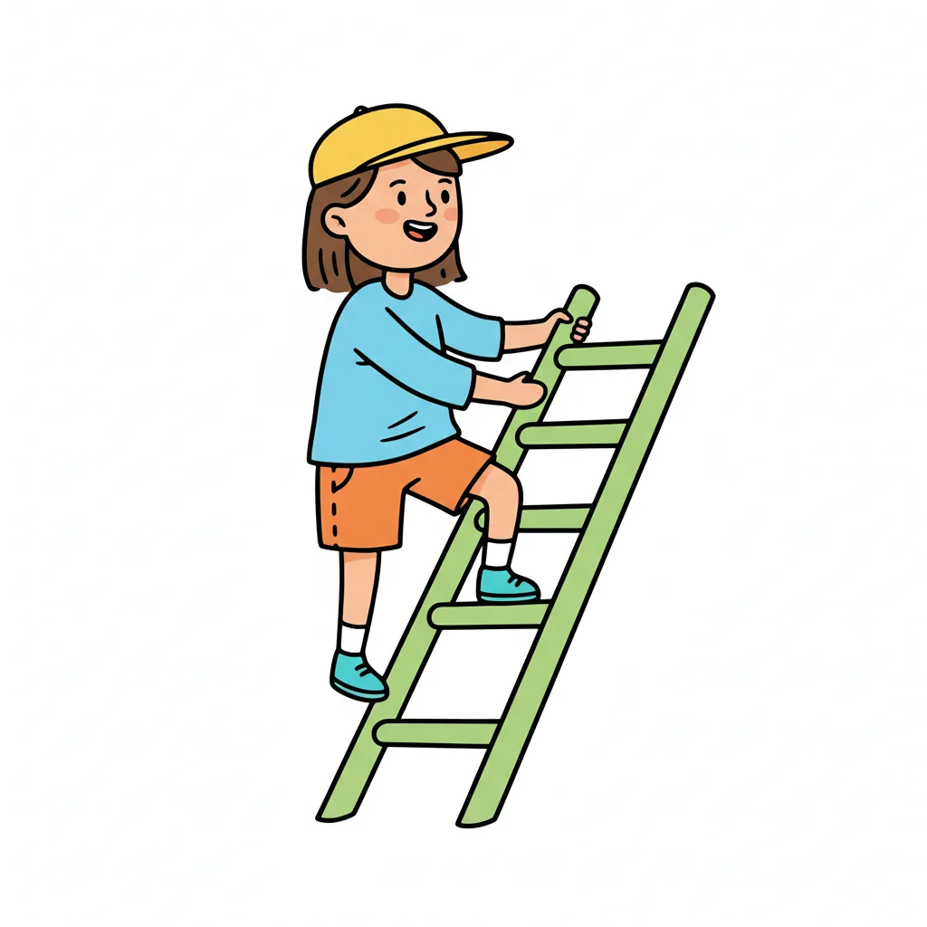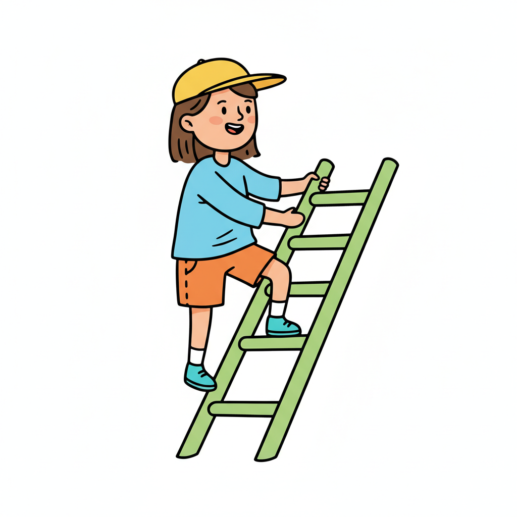 Glückliches Kind mit gelber Kappe klettert eine grüne Leiter hoch.