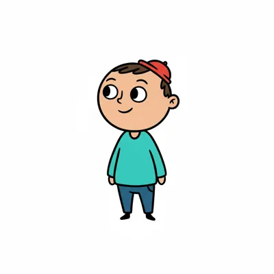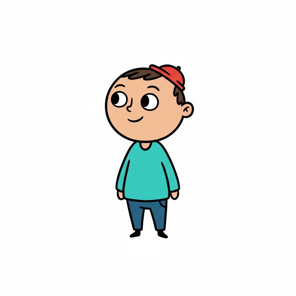 Zeichentrickjunge mit roter Kappe, türkisfarbenem Shirt und blauer Hose, lächelt und schaut zur Seite.