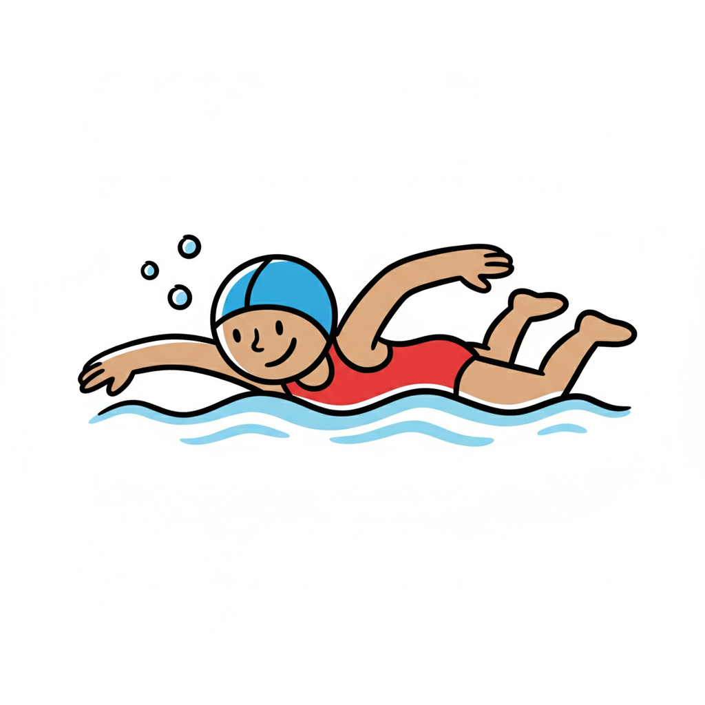 Cartoon einer lächelnden Person mit Badekappe und rotem Badeanzug, die im Wasser schwimmt.