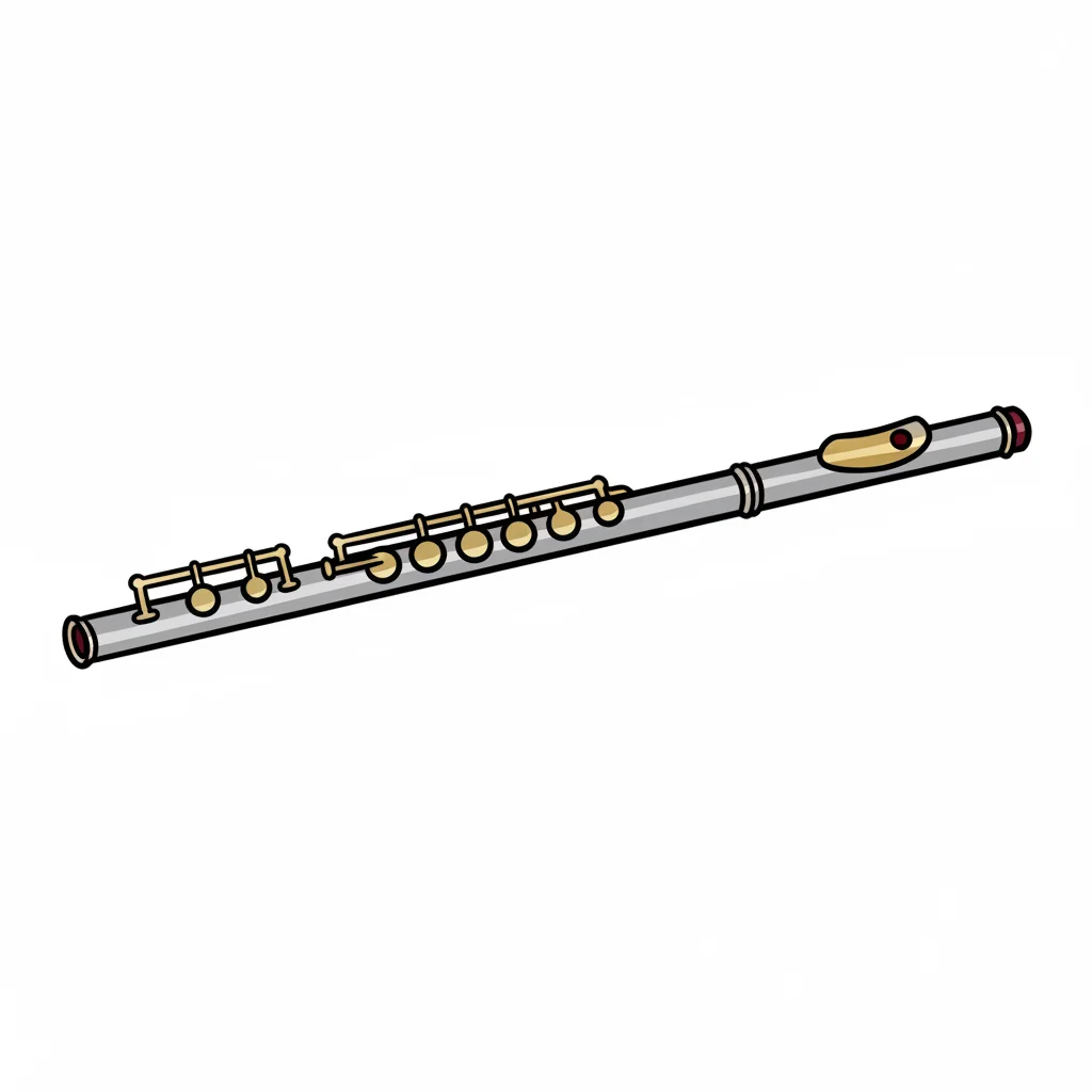 Eine einfache Illustration einer silbernen Querflöte mit goldenen Klappen auf weißem Hintergrund.