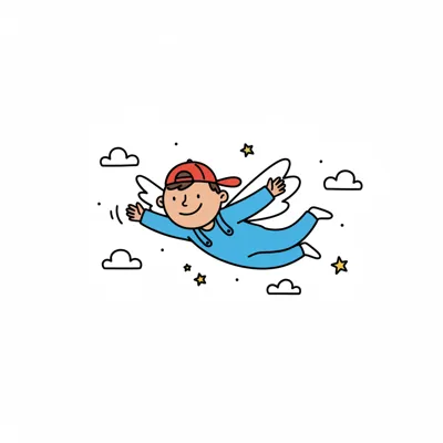 Ein lächelnder Cartoon-Junge mit Flügeln und roter Kappe fliegt zwischen Wolken und Sternen.