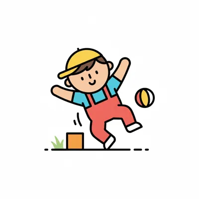 Ein fröhlicher Cartoon-Junge in Latzhose und Kappe springt neben einem Ball.